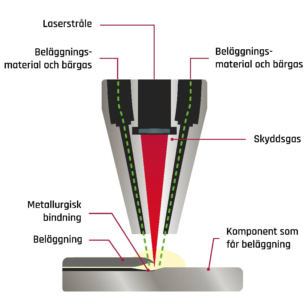 Laserpåsvetsningen är en process där vi smälter ren metall eller legeringspulver på en ny komponent eller på komponent som fordrar underhåll för att skydda ytan från korrosion eller slitage.
